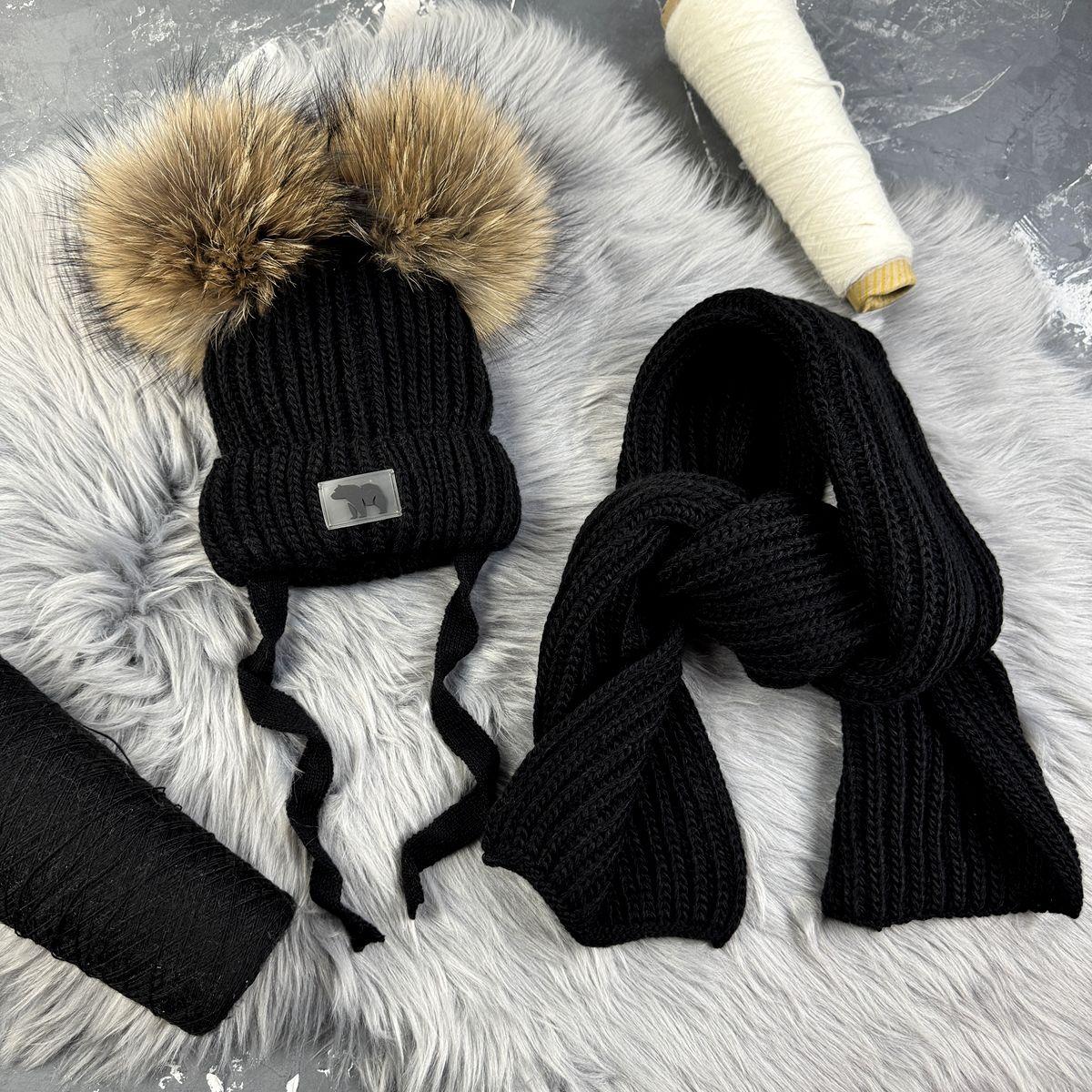 Зимовий дитячий комплект Bewarm : шапка та шарф в чорному кольорі на зав'язках пампонами з натурального хутра